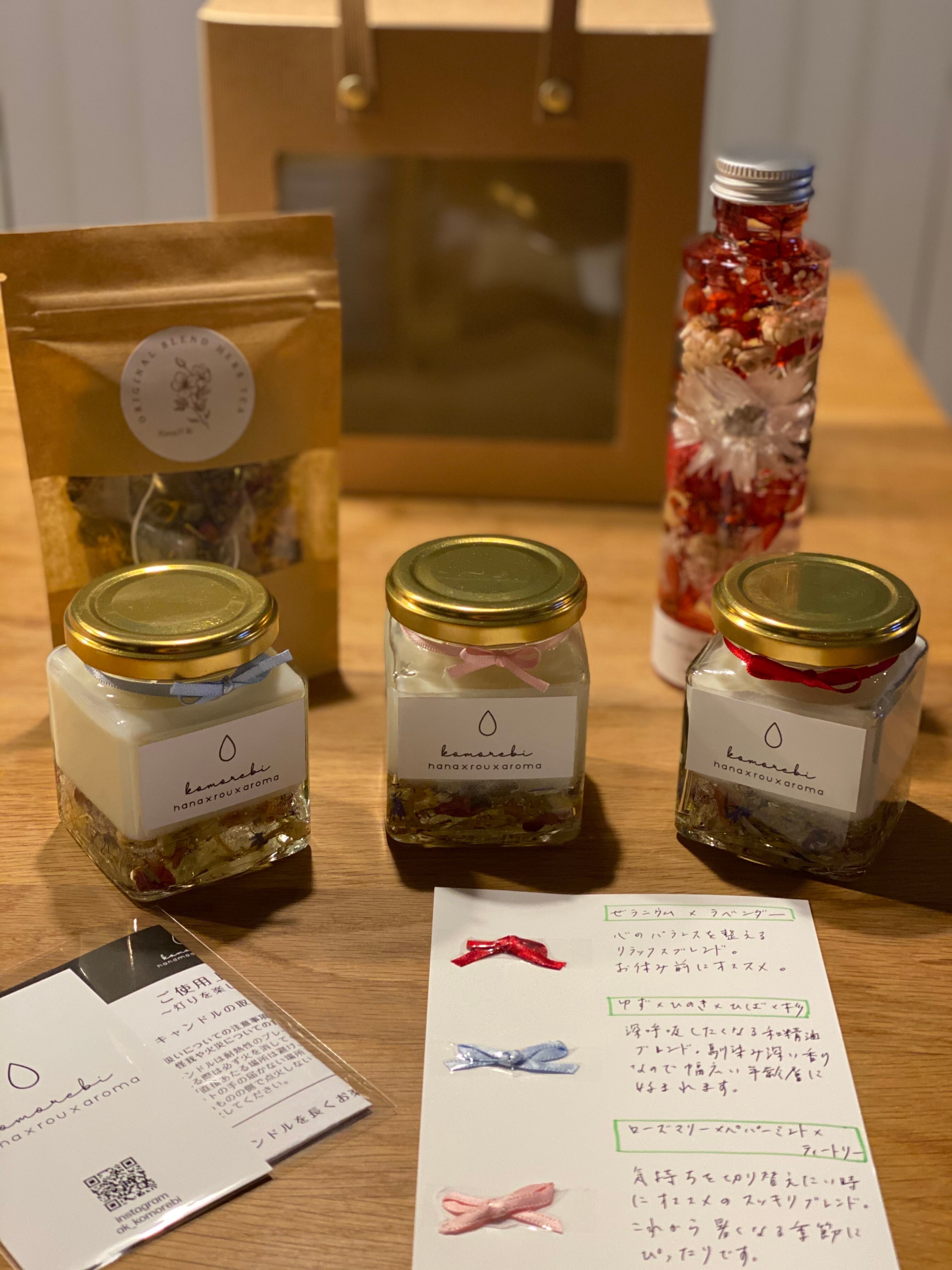 ・アロマキャンドルは自然由来のエッセンシャルオイルを使用した3種類の香りから選べます。